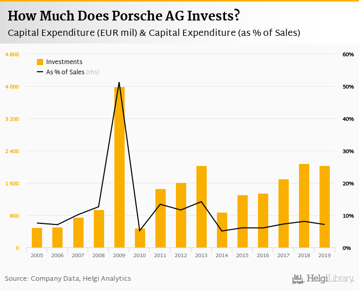 Porsche AG invested a total of EUR 2,031 mil in 2019, down 2.5% compared to the previous year. Historically, between 2005 - 2019, the company's investments stood at a high of EUR 3,987 mil in 2009 and a low of EUR 480 mil in 2010.
