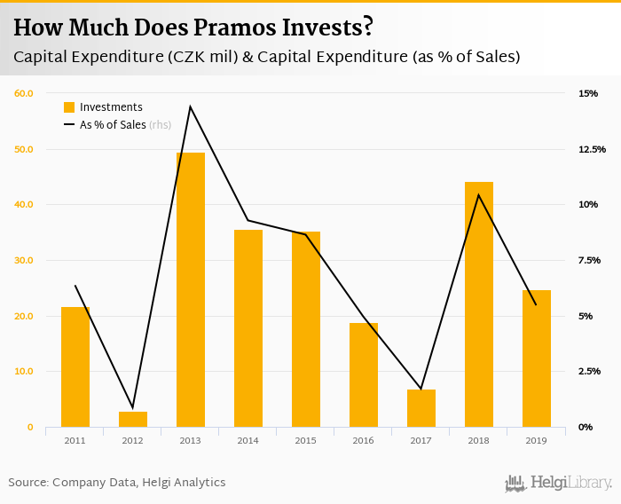 Pramos invested a total of CZK 24.8 mil in 2019, down 43.9% compared to the previous year. Historically, between 2011 - 2019, the company's investments stood at a high of CZK 49.5 mil in 2013 and a low of CZK 2.85 mil in 2012.