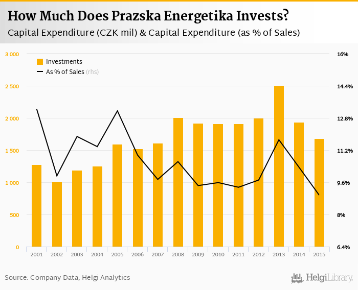 Prazska Energetika invested a total of CZK 1,681 mil in 2015, down 13.1% compared to the previous year. Historically, between 2000 - 2015, the company's investments stood at a high of CZK 2,511 mil in 2013 and a low of CZK 1,016 mil in 2002.