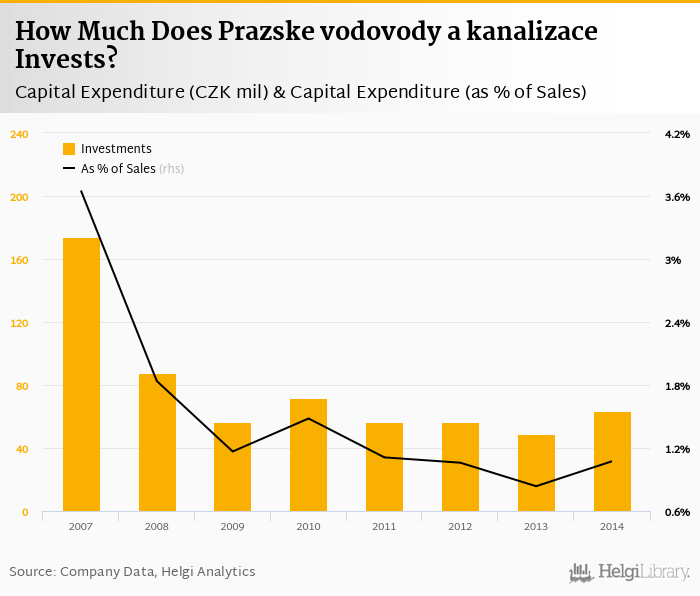 Prazske vodovody a kanalizace invested a total of CZK 63.4 mil in 2014, up 28.8% compared to the previous year. Historically, between 2007 - 2014, the company's investments stood at a high of CZK 174 mil in 2007 and a low of CZK 49.2 mil in 2013.
