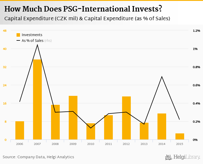 PSG-International invested a total of CZK 2.74 mil in 2015, down 76.2% compared to the previous year. Historically, between 2006 - 2015, the company's investments stood at a high of CZK 35.4 mil in 2007 and a low of CZK 2.74 mil in 2015.