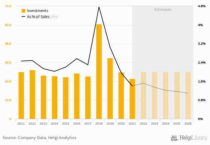 As a percentage of total sales, investments stood at 1.40% in 2021, down from 1.96% as seen in the previous year. This is compared to an average of 2.69% over the last five years.