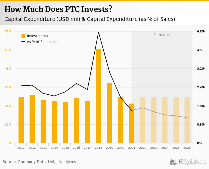 PTC invested a total of USD 25.7 mil in 2021, down 14.3% compared to the previous year. Historically, between 2011 - 2021, the company's investments stood at a high of USD 60.5 mil in 2018 and a low of USD 25.7 mil in 2021.