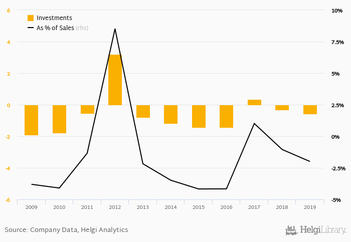 As a percentage of total sales, investments stood at -2.00% in 2019, down from -1.05% as seen in the previous year. This is compared to an average of -2.07% over the last five years.