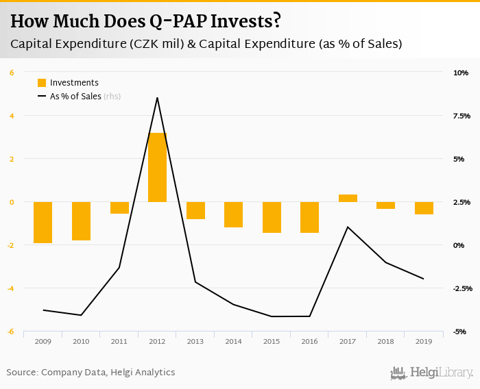 Q-PAP invested a total of CZK -0.573 mil in 2019, down 76.3% compared to the previous year. Historically, between 2009 - 2019, the company's investments stood at a high of CZK 3.20 mil in 2012 and a low of CZK -1.90 mil in 2009.