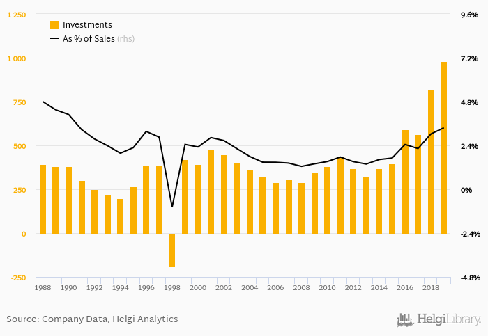 As a percentage of total sales, investments stood at 3.37% in 2019, up from 3.03% as seen in the previous year. This is compared to an average of 2.56% over the last five years.