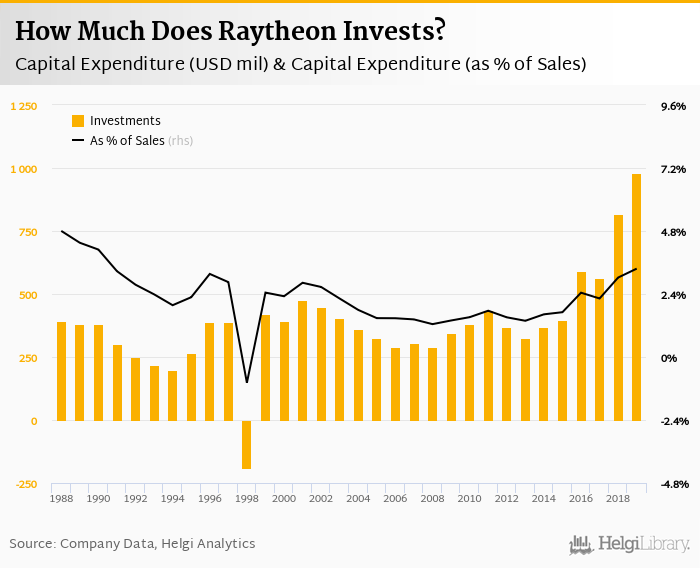 Raytheon invested a total of USD 982 mil in 2019, up 19.9% compared to the previous year. Historically, between 1988 - 2019, the company's investments stood at a high of USD 982 mil in 2019 and a low of USD -191 mil in 1998.