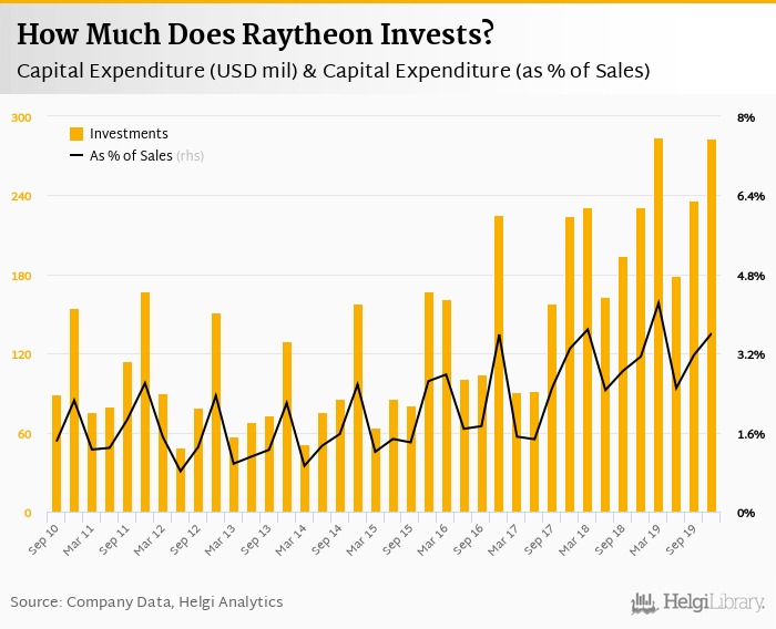 Raytheon invested a total of USD 283 mil in 4Q2019, up 22.5% compared to the previous year. Historically, between 1Q2010 - 4Q2019, the company's investments stood at a high of USD 284 mil in 1Q2019 and a low of USD 49.0 mil in 2Q2012.