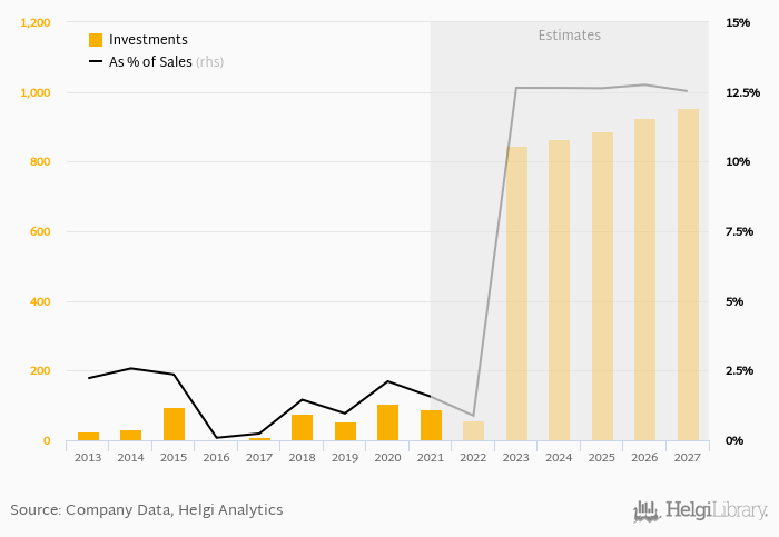 As a percentage of total sales, investments stood at 1.57% in 2021, down from 2.11% as seen in the previous year. This is compared to an average of 1.27% over the last five years.