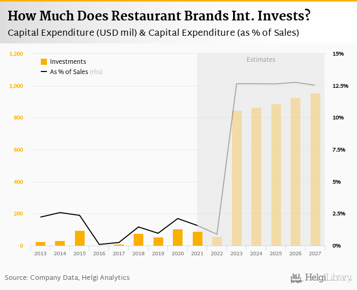 Restaurant Brands Int. invested a total of USD 90.0 mil in 2021, down 14.3% compared to the previous year. Historically, between 2013 - 2021, the company's investments stood at a high of USD 105 mil in 2020 and a low of USD 3.70 mil in 2016.