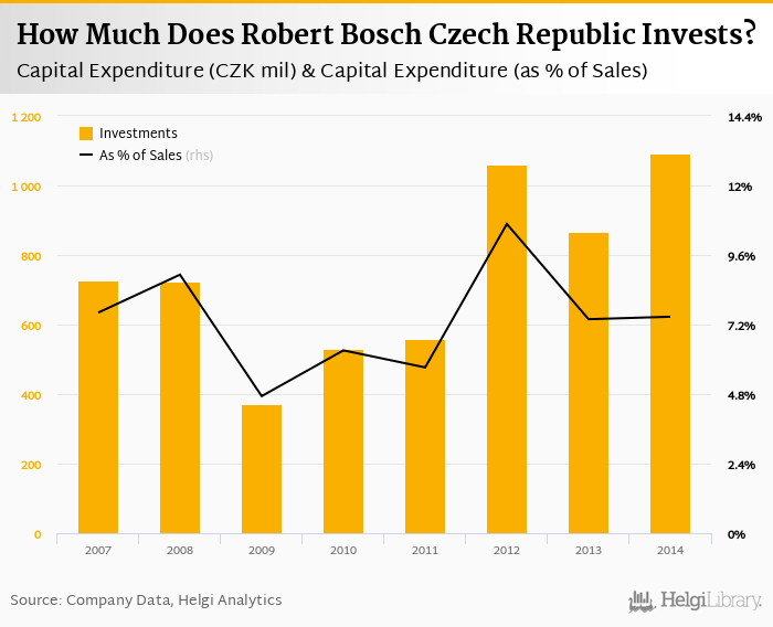 Robert Bosch Czech Republic invested a total of CZK 1,092 mil in 2014, up 25.9% compared to the previous year. Historically, between 2007 - 2014, the company's investments stood at a high of CZK 1,092 mil in 2014 and a low of CZK 370 mil in 2009.