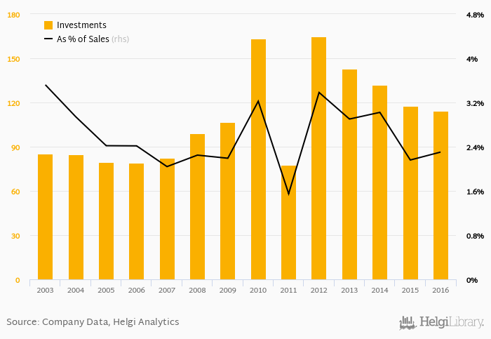 As a percentage of total sales, investments stood at 2.30% in 2016, up from 2.16% as seen in the previous year. This is compared to an average of 2.75% over the last five years.