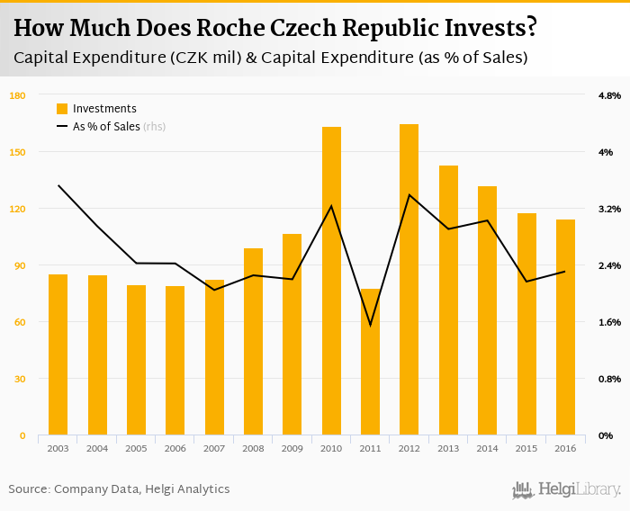 Roche Czech Republic invested a total of CZK 114 mil in 2016, down 2.81% compared to the previous year. Historically, between 2003 - 2016, the company's investments stood at a high of CZK 165 mil in 2012 and a low of CZK 77.6 mil in 2011.