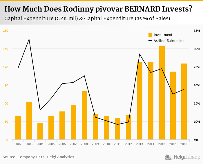 Rodinny pivovar BERNARD invested a total of CZK 126 mil in 2017, up 12.1% compared to the previous year. Historically, between 2002 - 2017, the company's investments stood at a high of CZK 155 mil in 2015 and a low of CZK 28.3 mil in 2004.