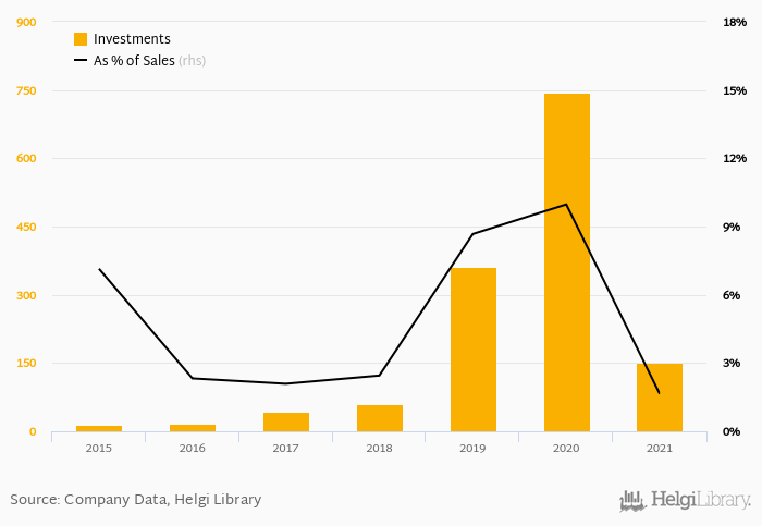 As a percentage of total sales, investments stood at 1.64% in 2021, down from 9.97% as seen in the previous year. This is compared to an average of 4.96% over the last five years.