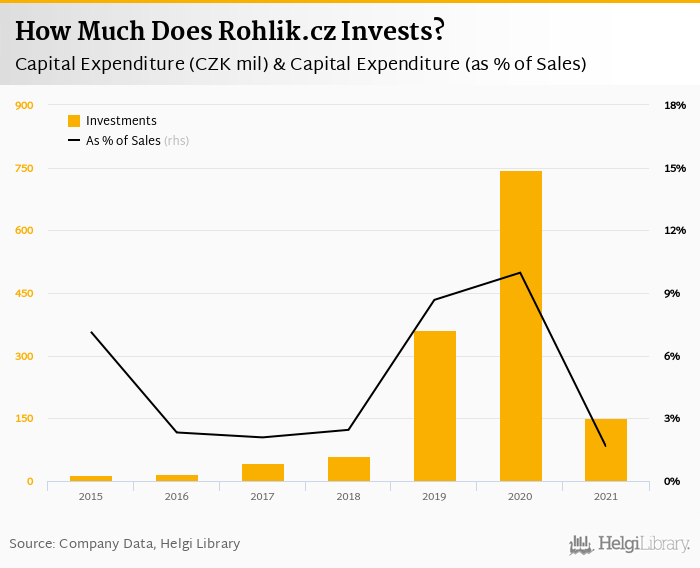 Rohlik.cz invested a total of CZK 151 mil in 2021, down 79.7% compared to the previous year. Historically, between 2015 - 2021, the company's investments stood at a high of CZK 743 mil in 2020 and a low of CZK 14.9 mil in 2015.