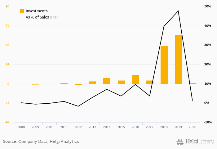 As a percentage of total sales, investments stood at 1.00% in 2020, down from 47.5% as seen in the previous year. This is compared to an average of 20.2% over the last five years.