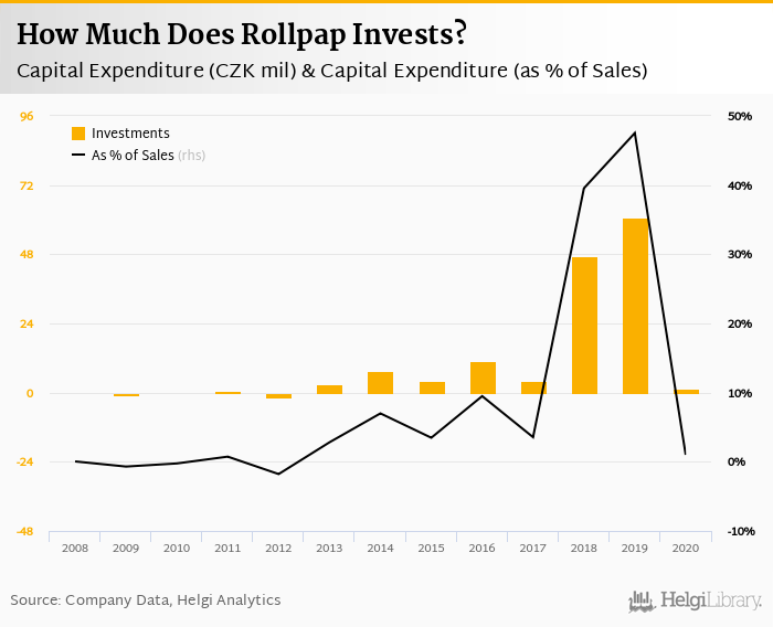 Rollpap invested a total of CZK 1.22 mil in 2020, down 98% compared to the previous year. Historically, between 2008 - 2020, the company's investments stood at a high of CZK 60.9 mil in 2019 and a low of CZK -1.78 mil in 2012.