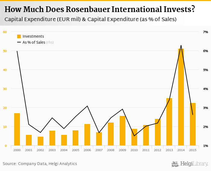 Rosenbauer International invested a total of EUR 22.5 mil in 2015, down 55.9% compared to the previous year. Historically, between 2000 - 2015, the company's investments stood at a high of EUR 51.1 mil in 2014 and a low of EUR 4.81 mil in 2002.