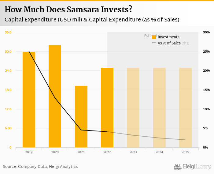 Samsara invested a total of USD 25.0 mil in 2022, up 29.2% compared to the previous year. Historically, between 2019 - 2022, the company's investments stood at a high of USD 32.1 mil in 2020 and a low of USD 19.4 mil in 2021.