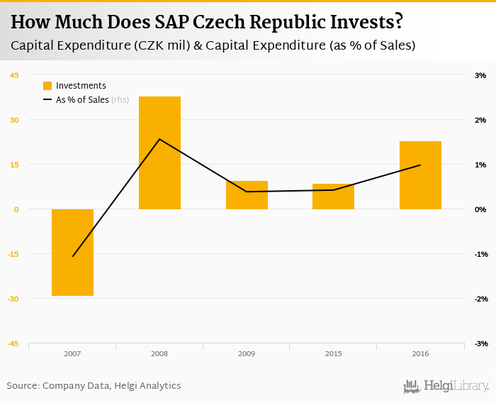 SAP Czech Republic invested a total of CZK 23.0 mil in 2016, up 166% compared to the previous year. Historically, between 2007 - 2016, the company's investments stood at a high of CZK 37.8 mil in 2008 and a low of CZK -29.1 mil in 2007.