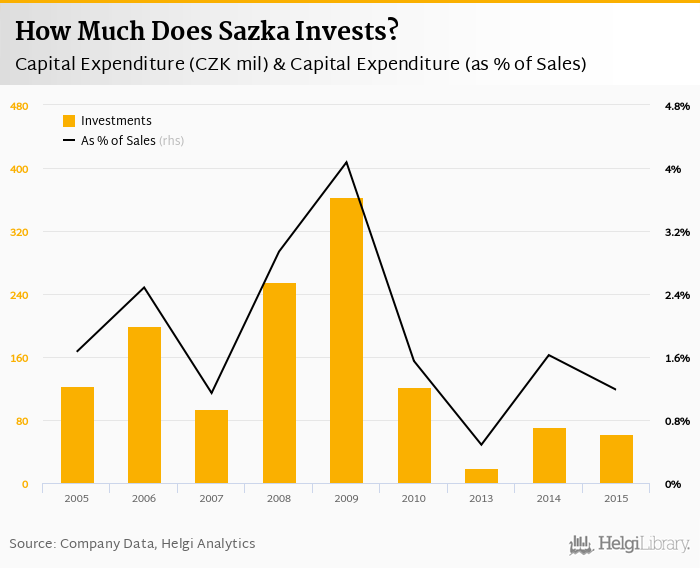 Sazka invested a total of CZK 62.3 mil in 2015, down 12.6% compared to the previous year. Historically, between 2005 - 2015, the company's investments stood at a high of CZK 364 mil in 2009 and a low of CZK 18.7 mil in 2013.
