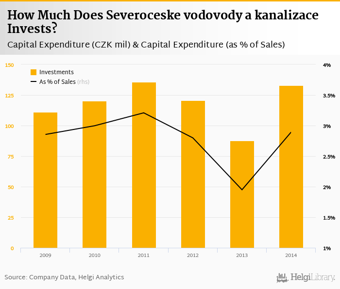 Severoceske vodovody a kanalizace invested a total of CZK 133 mil in 2014, up 51.6% compared to the previous year. Historically, between 2009 - 2014, the company's investments stood at a high of CZK 136 mil in 2011 and a low of CZK 87.7 mil in 2013.