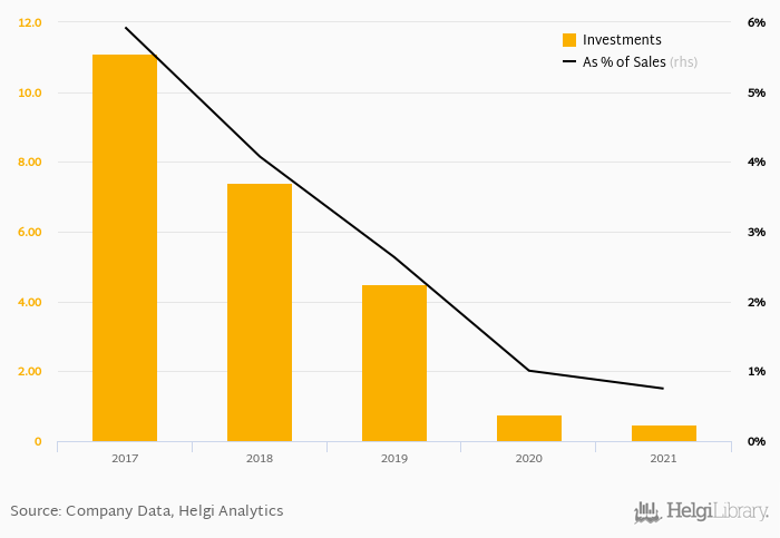As a percentage of total sales, investments stood at 0.753% in 2021, down from 1.01% as seen in the previous year. This is compared to an average of 2.88% over the last five years.