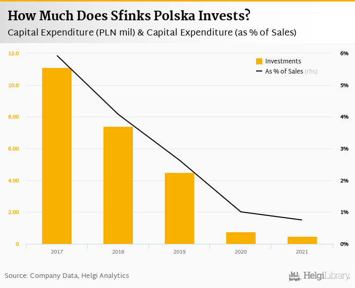 Sfinks Polska invested a total of PLN 0.481 mil in 2021, down 38.3% compared to the previous year. Historically, between 2017 - 2021, the company's investments stood at a high of PLN 11.1 mil in 2017 and a low of PLN 0.481 mil in 2021.