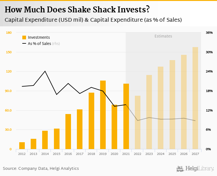 Shake Shack invested a total of USD 101 mil in 2021, up 47% compared to the previous year. Historically, between 2012 - 2021, the company's investments stood at a high of USD 107 mil in 2019 and a low of USD 11.0 mil in 2012.