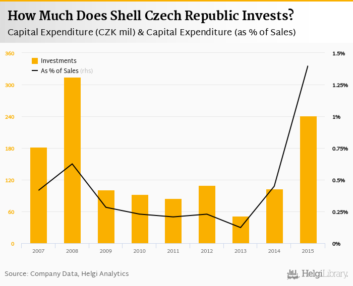 Shell Czech Republic invested a total of CZK 241 mil in 2015, up 134% compared to the previous year. Historically, between 2007 - 2015, the company's investments stood at a high of CZK 314 mil in 2008 and a low of CZK 51.1 mil in 2013.