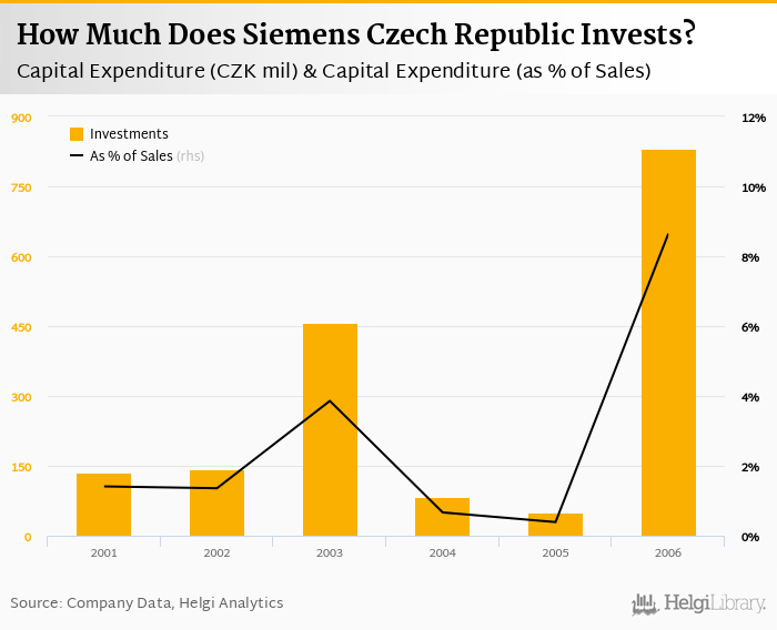 Siemens Czech Republic invested a total of CZK 830 mil in 2006, up 1% compared to the previous year. Historically, between 2001 - 2006, the company's investments stood at a high of CZK 830 mil in 2006 and a low of CZK 50.0 mil in 2005.