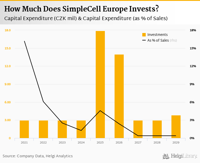 SimpleCell Europe invested a total of in , down 0% compared to the previous year. Historically, between 2021 - , the company's investments stood at a high of CZK 17.9 mil in 2025 and a low of CZK 2.95 mil in 2028.