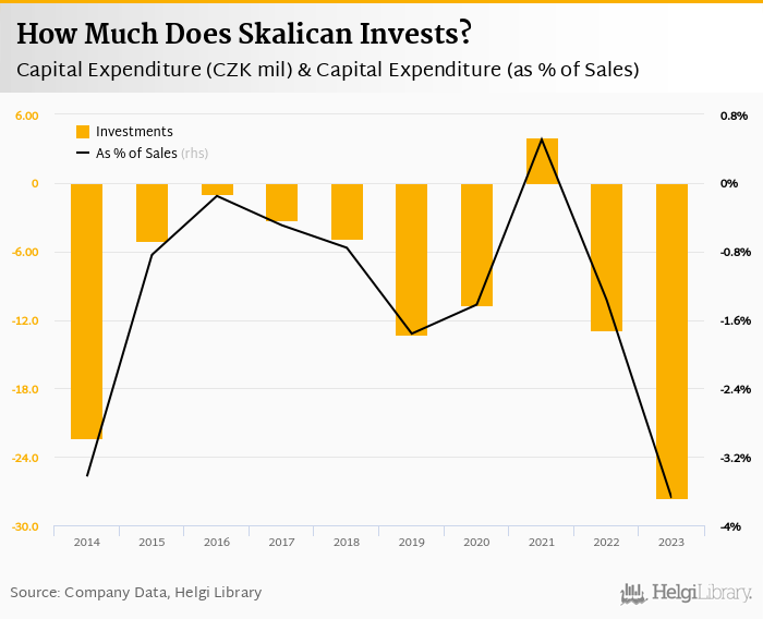 Skalican invested a total of CZK -27.6 mil in 2023, down 114% compared to the previous year. Historically, between 2014 - 2023, the company's investments stood at a high of CZK 3.95 mil in 2021 and a low of CZK -27.6 mil in 2023.