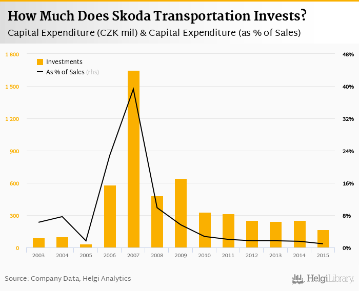 Skoda Transportation invested a total of CZK 166 mil in 2015, down 33.9% compared to the previous year. Historically, between 2003 - 2015, the company's investments stood at a high of CZK 1,648 mil in 2007 and a low of CZK 33.0 mil in 2005.