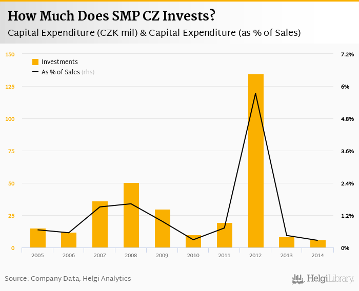 SMP CZ invested a total of CZK 6.13 mil in 2014, down 28% compared to the previous year. Historically, between 2005 - 2014, the company's investments stood at a high of CZK 135 mil in 2012 and a low of CZK 6.13 mil in 2014.