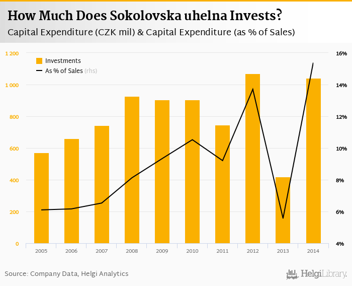 Sokolovska uhelna invested a total of CZK 1,041 mil in 2014, up 149% compared to the previous year. Historically, between 2005 - 2014, the company's investments stood at a high of CZK 1,068 mil in 2012 and a low of CZK 419 mil in 2013.