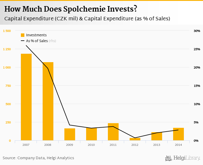 As far as Spolchemie's peers are concerned, Synthos Kralupy invested CZK 93.1 mil, or 0.508% of its sales in 2014. Comparable figures for Grupa Azoty are PLN 676 mil and 6.83%.
