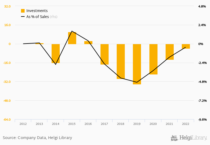 As a percentage of total sales, investments stood at -0.443% in 2022, up from -1.71% as seen in the previous year. This is compared to an average of -2.97% over the last five years.