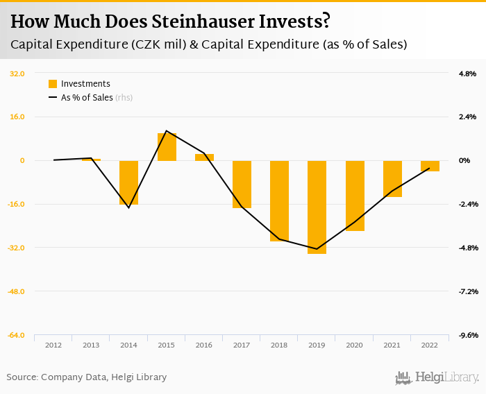 Steinhauser invested a total of CZK -3.83 mil in 2022, up 71.5% compared to the previous year. Historically, between 2012 - 2022, the company's investments stood at a high of CZK 10.1 mil in 2015 and a low of CZK -34.1 mil in 2019.
