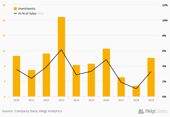 As a percentage of total sales, investments stood at 3.26% in 2019, up from 1.01% as seen in the previous year. This is compared to an average of 2.84% over the last five years.