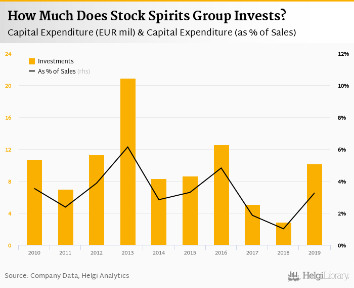 Stock Spirits Group invested a total of EUR 10.2 mil in 2019, up 257% compared to the previous year. Historically, between 2010 - 2019, the company's investments stood at a high of EUR 20.9 mil in 2013 and a low of EUR 2.85 mil in 2018.
