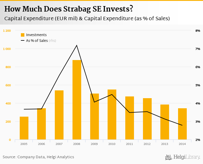 Strabag SE invested a total of EUR 346 mil in 2014, down 10.6% compared to the previous year. Historically, between 2005 - 2014, the company's investments stood at a high of EUR 877 mil in 2008 and a low of EUR 255 mil in 2005.