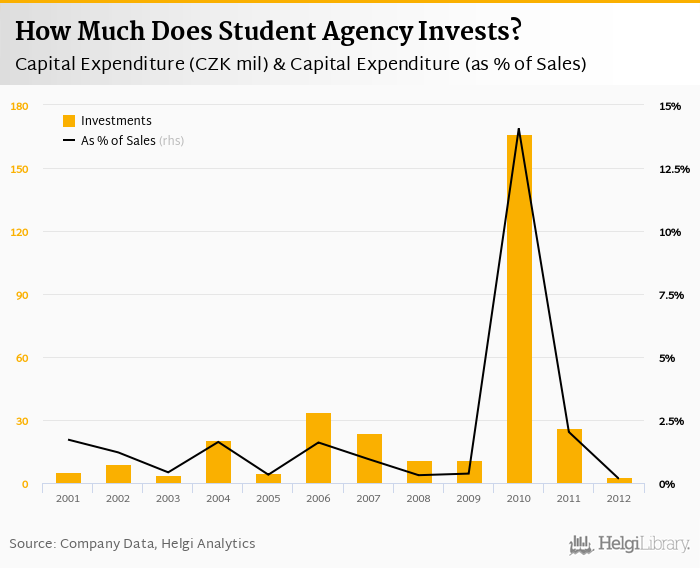 Student Agency invested a total of CZK 2.70 mil in 2012, down 89.6% compared to the previous year. Historically, between 2001 - 2012, the company's investments stood at a high of CZK 166 mil in 2010 and a low of CZK 2.70 mil in 2012.