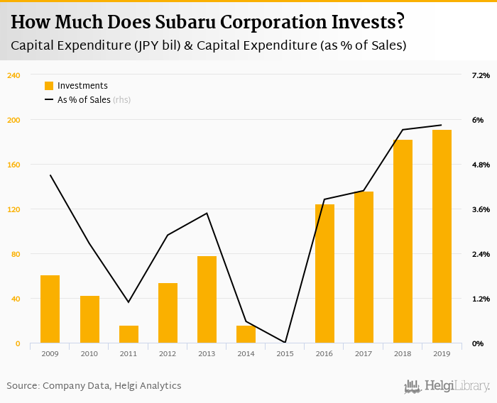 Subaru Corporation invested a total of JPY 191 bil in 2019, up 4.81% compared to the previous year. Historically, between 2009 - 2019, the company's investments stood at a high of JPY 191 bil in 2019 and a low of JPY 0 bil in 2015.