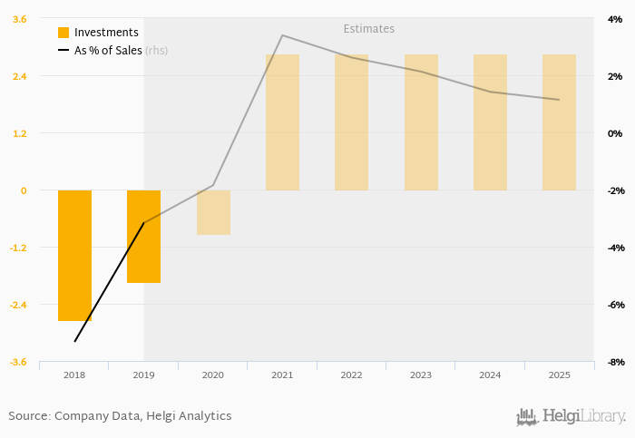 As a percentage of total sales, investments stood at -3.17% in 2019, up from -7.34% as seen in the previous year. This is compared to an average of -5.25% over the last five years.
