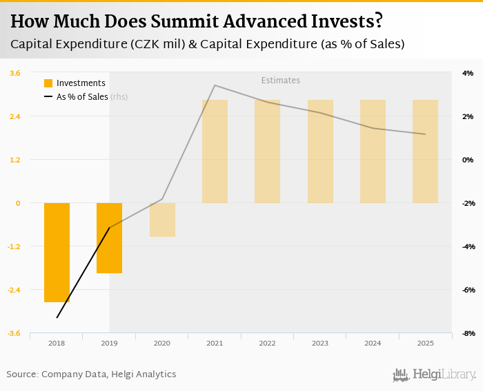 Summit Advanced invested a total of CZK -1.95 mil in 2019, up 29.2% compared to the previous year. Historically, between 2018 - 2019, the company's investments stood at a high of CZK -1.95 mil in 2019 and a low of CZK -2.75 mil in 2018.