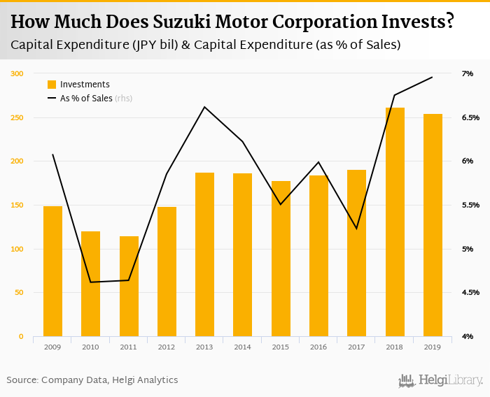 Suzuki Motor Corporation invested a total of JPY 255 bil in 2019, down 2.59% compared to the previous year. Historically, between 2009 - 2019, the company's investments stood at a high of JPY 261 bil in 2018 and a low of JPY 115 bil in 2011.