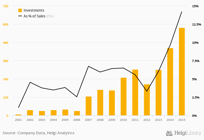 As a percentage of total sales, investments stood at 14.2% in 2015, up from 9.62% as seen in the previous year. This is compared to an average of 7.75% over the last five years.