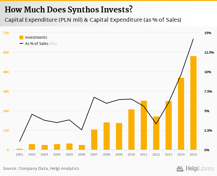 Synthos invested a total of PLN 577 mil in 2015, up 29.8% compared to the previous year. Historically, between 2001 - 2015, the company's investments stood at a high of PLN 577 mil in 2015 and a low of PLN 8.17 mil in 2001.